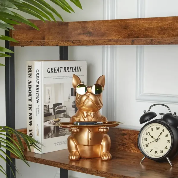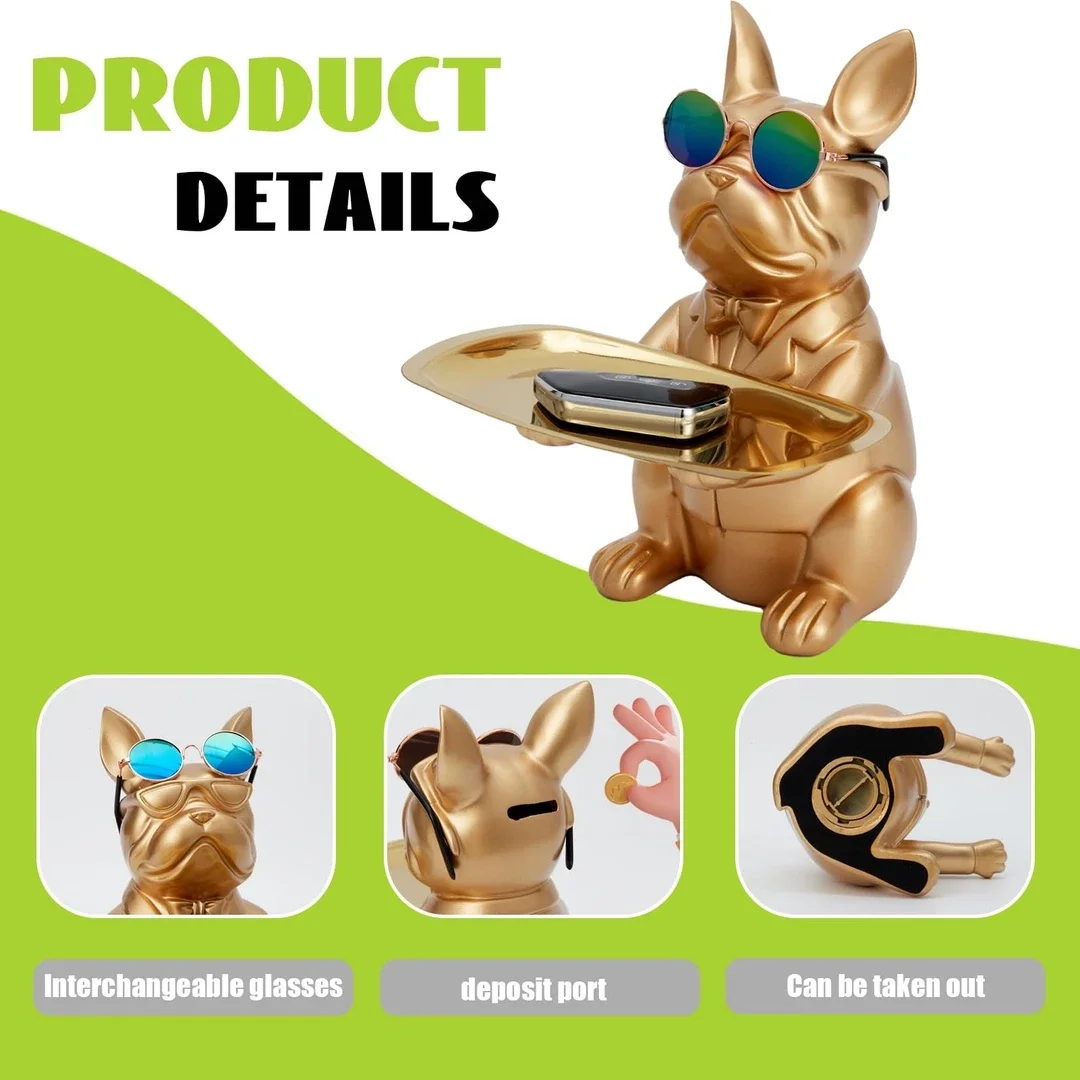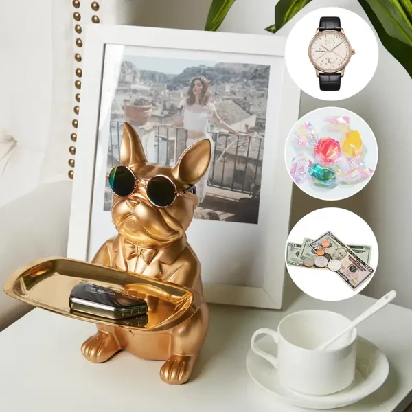 Verkauft wird eine edel gehaltene Bulldoggen-Statue in Gold-Finish mit dekorativem Tablett und Spardosen-Funktion. Ideal als Blickfang in deinem Eingangsbereich, Wohnzimmer oder als Geschenk-Accessoire.