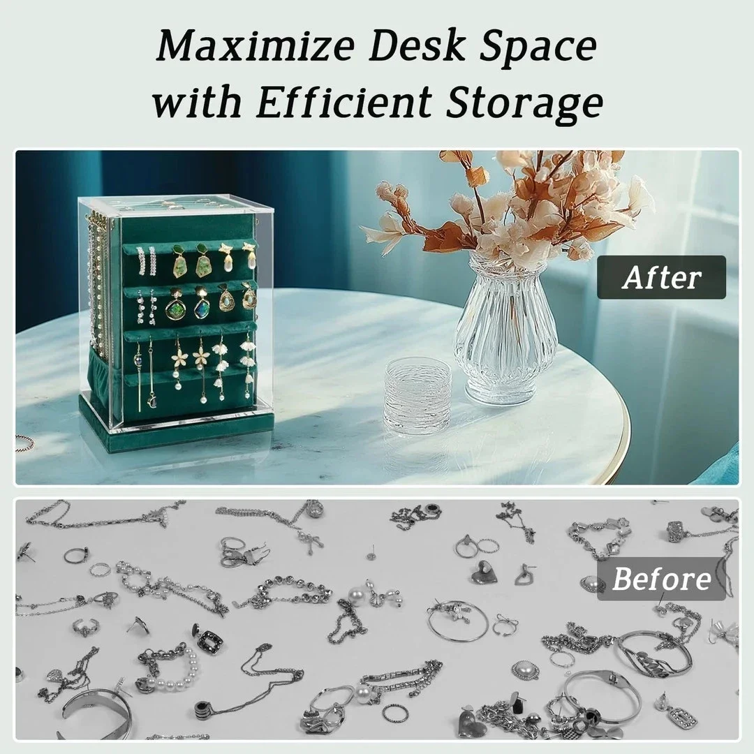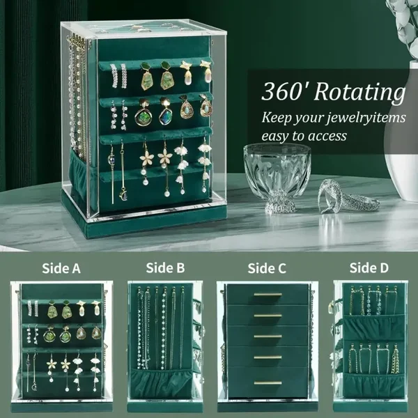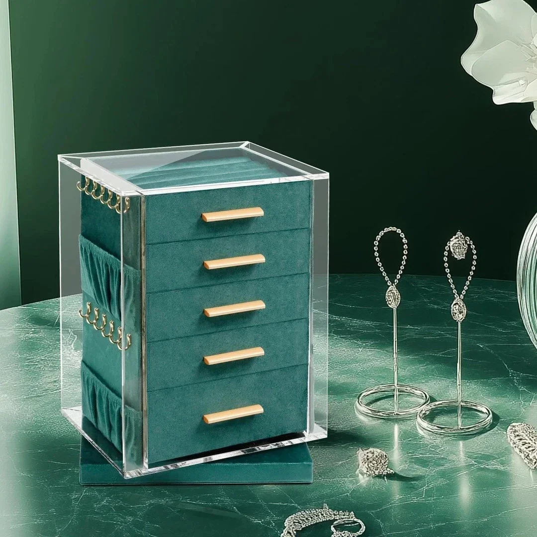 Mit ihrem 360° drehbaren Aufbau, den 5 transparenten Schubladen und dem edlen Glasdeckel bietet sie reichlich Platz für Ringe, Ohrringe, Armbänder, Halsketten und mehr – alles übersichtlich sortiert und griffbereit.
