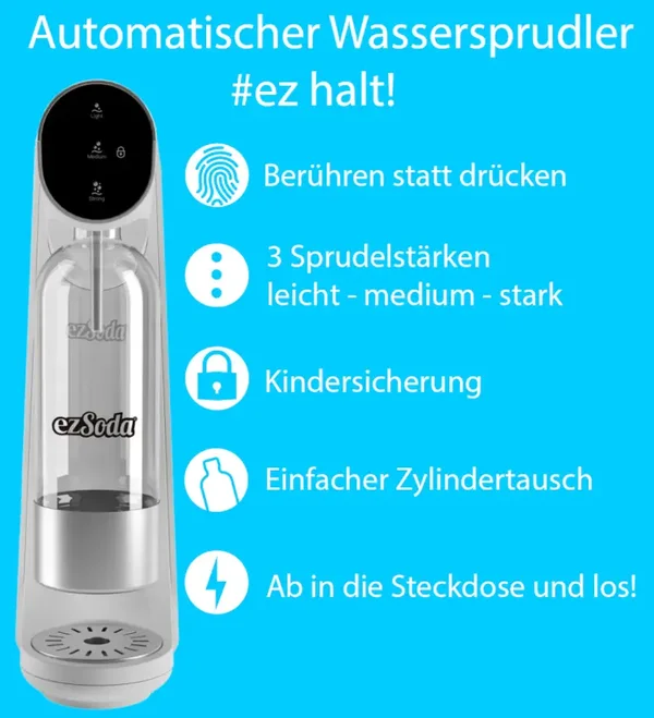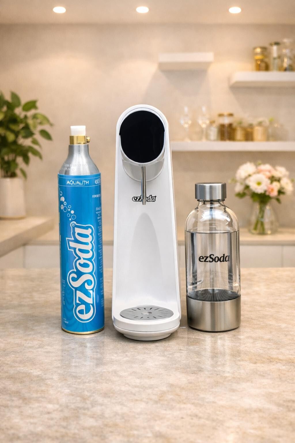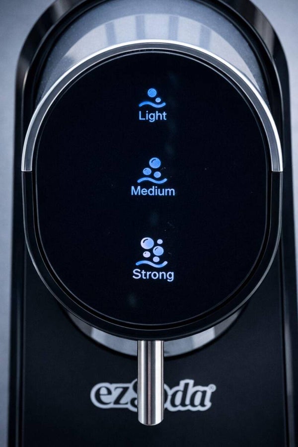 Mit der ezSoda® Maschine genießen Sie jederzeit frisches Sprudelwasser – ohne Schleppen schwerer Kisten. Dank drei Sprudelstufen bestimmen Sie selbst, wie prickelnd Ihr Wasser sein soll. Praktisch, kompakt und nachhaltig.